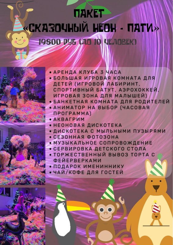 Все понравилось по просмотренному видео. Жена ходила с ребенком в клуб, где проводился день рождения, рассчитанный на десять человек и включающий в себя неоновую вечеринку с пузырями. Выбрали центр, потому что он находится близко к дому, знаем, что в нем и как, да и дочка много раз в него ходила. У ребенка остались положительные впечатления от мероприятия. Отмечали в организации и дни рождения других детей (может, четыре раза) и оставались довольными.